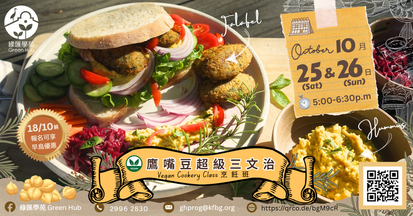 - 每位參加者可獲製作一份鷹嘴豆餅及鷹嘴豆泥三文治帶回家,以及即場試食2款食物