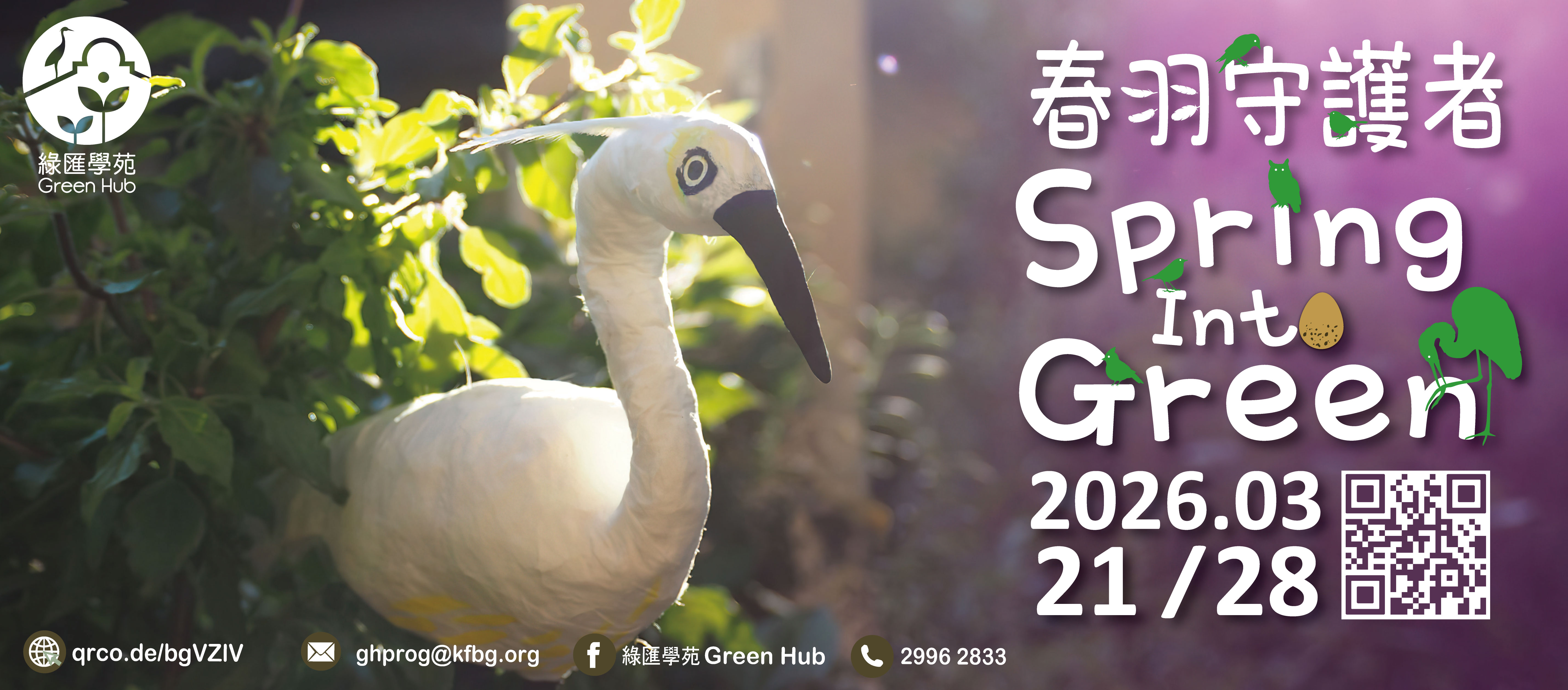 學苑將聯同本地著名紙塑創作團隊 Hira hira,以鷺鳥及最常獲嘉道理農場暨植物園所接收拯救的十種野鳥為切入點,舉辦多場紙塑雀鳥藝術及城市生態欣賞活動。學生將合力製作逾百隻紙塑雀鳥共同創作「春羽守護者」專題展覽,於2026年2月至5月春季雀鳥繁殖期,於綠匯學苑展出以喚起公眾對環境保育的關注。所有參加學生均可獲「春羽守護者」證書,以表揚積極參與生物多樣性保育行動。學校可在展覽後領回紙塑雀鳥展品,以進一步在校推廣生態保育訊息。